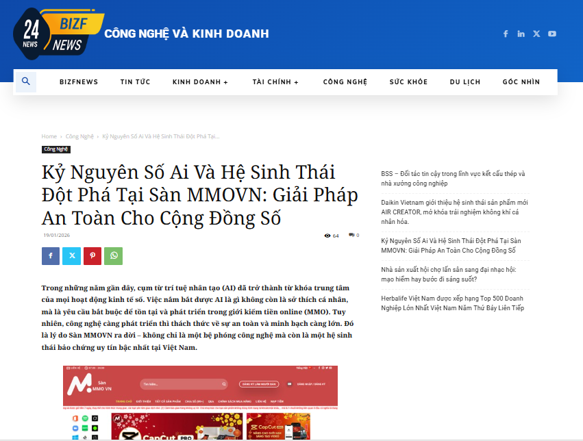 3.4. Báo bizfnews đưa tin với tiêu đề: ” Kỷ Nguyên Số Ai Và Hệ Sinh Thái Đột Phá Tại Sàn MMOVN: Giải Pháp An Toàn Cho Cộng Đồng Số“