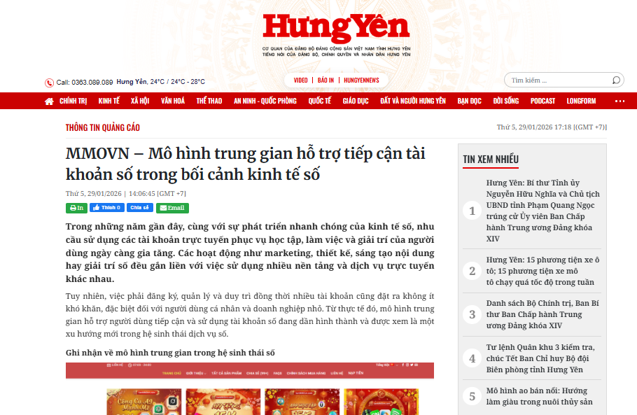 3.1. Báo Hưng Yên đưa tin với tiêu đề ” MMOVN – Mô hình trung gian hỗ trợ tiếp cận tài khoản số trong bối cảnh kinh tế số “